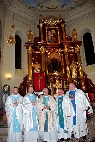 Księża rodacy po Mszy św. o powołania w wieczór nawiedzenia Krzyża wielkopiątkowego św. Jana Pawła II.
